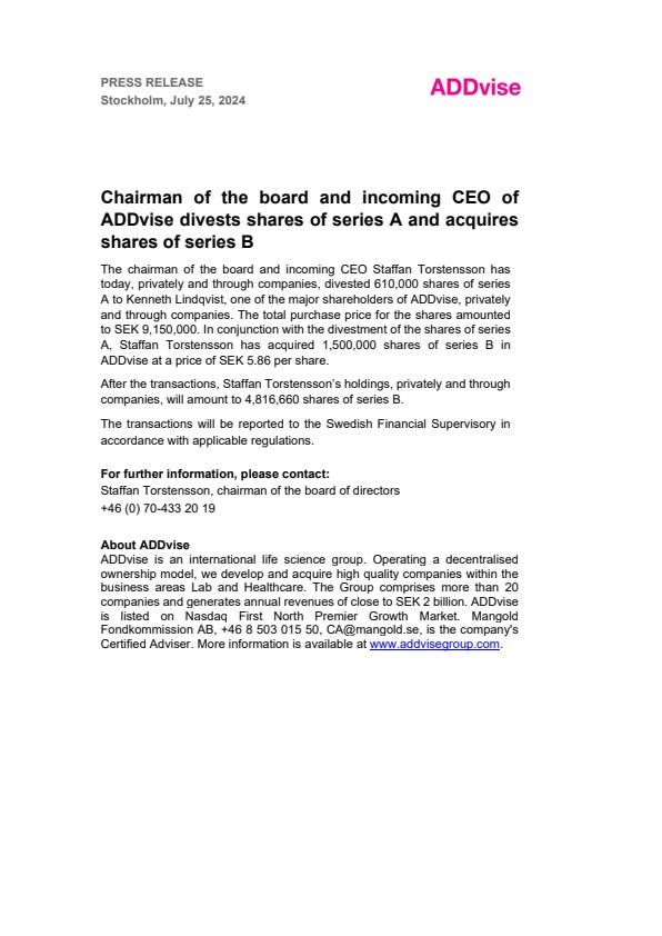 The chairman of the board and incoming CEO Staffan Torstensson has today, privately and through companies, divested 610,000 shares of series A to Kenneth Lindqvist, one of the major shareholders of ADDvise, privately and through companies. The total purchase price for the shares amounted to SEK 9,150,000. In conjunction with the divestment of the shares of series A, Staffan Torstensson has acquired 1,500,000 shares of series B in ADDvise at a price of SEK 5.86 per share.