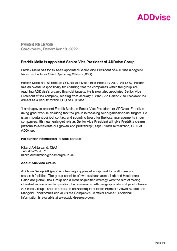 Fredrik Mella has today been appointed Senior Vice President of ADDvise alongside his current role as Chief Operating Officer (COO).