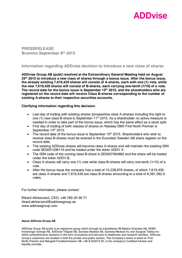- The existing ADDvise shares will become class A-shares and will maintain the existing ISIN code SE0001306119 and be traded under the ticker ADDV A.