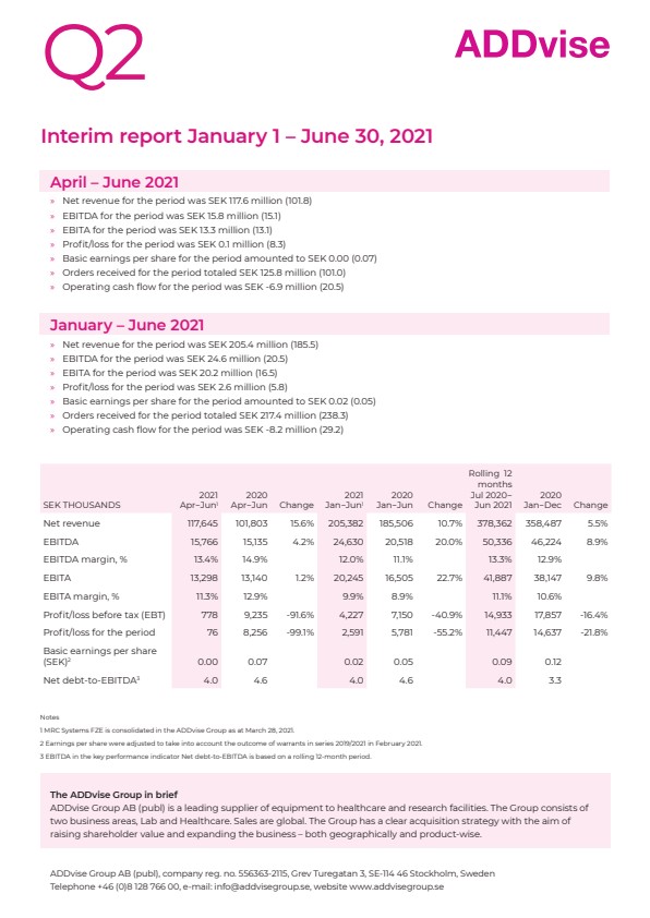 The second quarter of 2021 marked a shift in momentum, as ADDvise completed two significant milestones in its strategy acquisition. The first being the acquisition of MRC, which was consolidated in full during the second quarter of 2021. MRC marks a significant contribution to both ADDvise’s geographical footprint, product offering and size. The second significant event was the refinancing of the publicly traded Bond. The Bond issue saw strong demand and was significantly oversubscribed. The refinancing will enable ADDvise to continue along its path of growth.