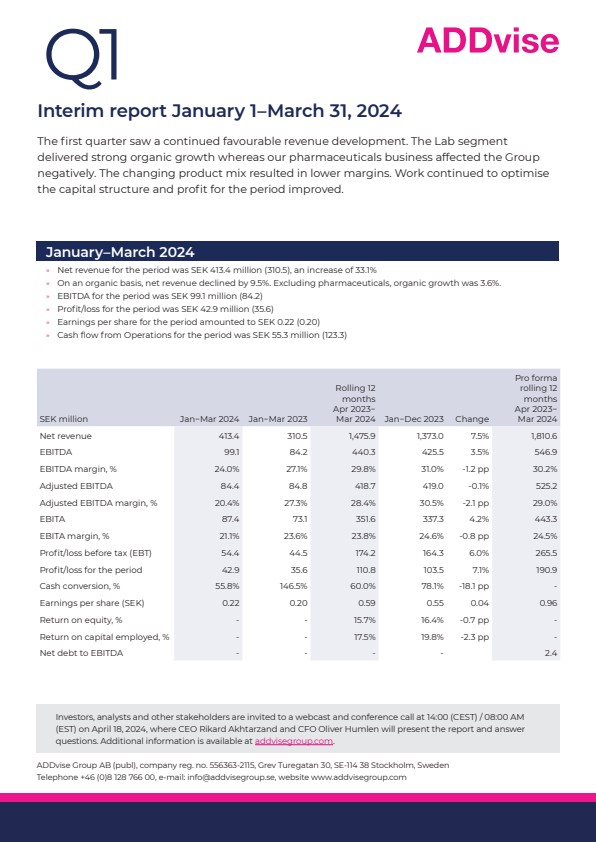 This information is information that ADDvise Group AB is required to disclose under the EU Market Abuse Regulation. The information was submitted for publication on April 18, 2024 at 07:45 CEST.