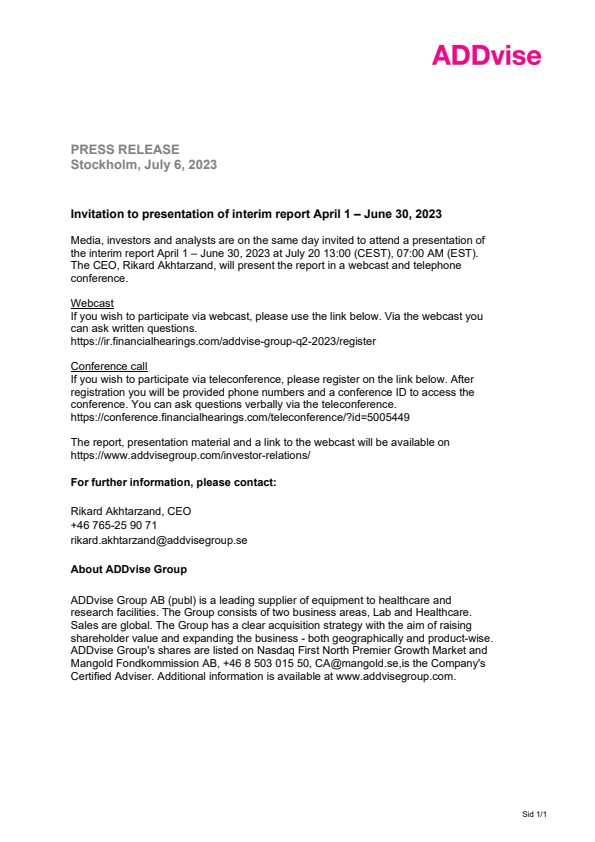 ADDvise Group AB (publ) is a leading supplier of equipment to healthcare and research facilities. The Group consists of two business areas, Lab and Healthcare. Sales are global. The Group has a clear acquisition strategy with the aim of raising shareholder value and expanding the business – both geographically and product-wise. ADDvise Group’s shares are listed on Nasdaq First North Premier Growth Market and Mangold Fondkommission AB, +46 8 503 015 50, CA@mangold.se,is the Company’s Certified Adviser. Additional information is available at www.addvisegroup.com.