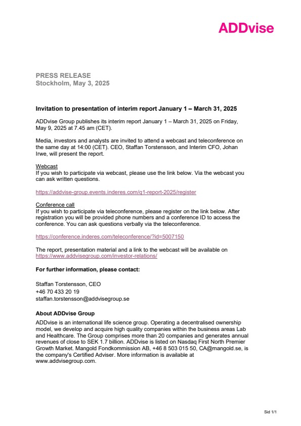ADDvise Group publishes its interim report January 1 – March 31, 2025 on Friday, May 9, 2025 at 7.45 am (CET).