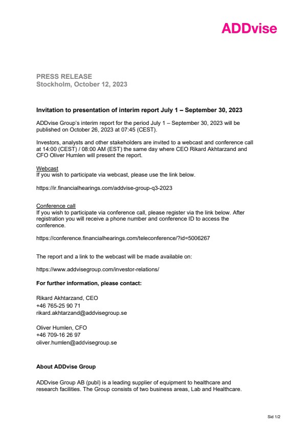 ADDvise Group’s interim report for the period July 1 – September 30, 2023 will be published on October 26, 2023 at 07:45 (CEST).