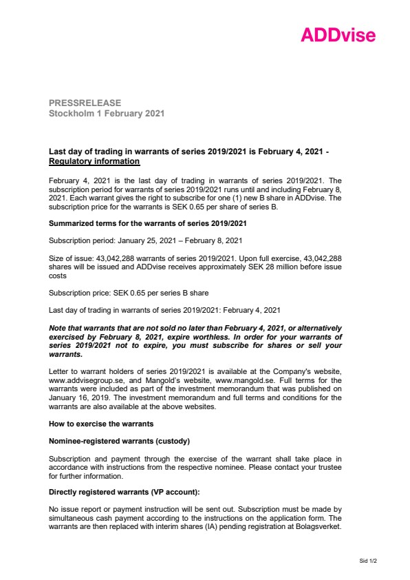 February 4, 2021 is the last day of trading in warrants of series 2019/2021. The subscription period for warrants of series 2019/2021 runs until and including February 8, 2021. Each warrant gives the right to subscribe for one (1) new B share in ADDvise. The subscription price for the warrants is SEK 0.65 per share of series B.