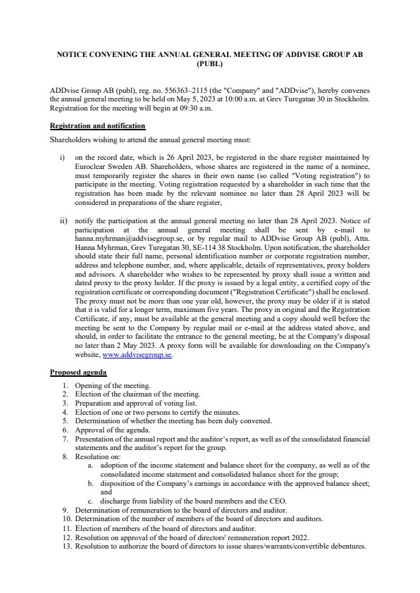 ADDvise Group AB (publ), reg. no. 556363–2115 (the “Company” and “ADDvise”), hereby convenes the annual general meeting to be held on May 5, 2023 at 10:00 a.m. at Grev Turegatan 30 in Stockholm. Registration for the meeting will begin at 09:30 a.m.