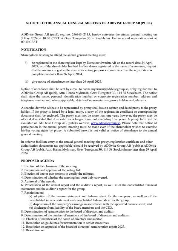 ADDvise Group AB (publ), reg. no. 556363–2115, hereby convenes the annual general meeting on 3 May 2024 at 10:00 CEST at Grev Turegatan 30 in Stockholm. Entrance and registration start at 09.30 CEST.