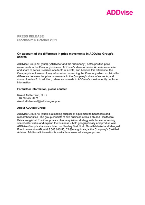 ADDvise Group AB (publ) (“ADDvise” and the “Company”) notes positive price movements in the Company’s shares. ADDvise’s share of series A carries one vote and share of series B carries one tenth of a vote, and besides this difference, the Company is not aware of any information concerning the Company which explains the difference between the price movements in the Company’s share of series A, and share of series B. In addition, reference is made to ADDvise’s most recently published information.