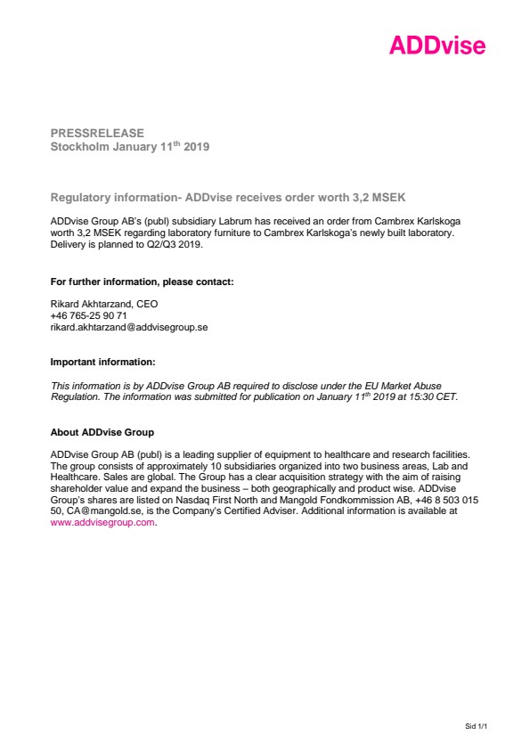 ADDvise Group AB’s (publ) subsidiary Labrum has received an order from Cambrex Karlskoga worth 3,2 MSEK regarding laboratory furniture to Cambrex Karlskoga’s newly built laboratory. Delivery is planned to Q2/Q3 2019.