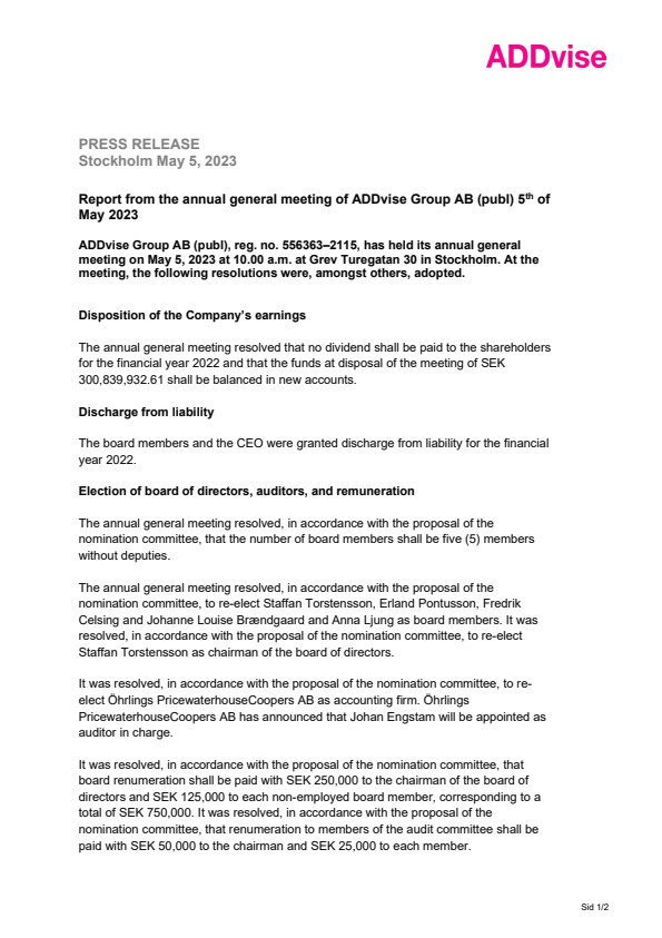 ADDvise Group AB (publ), reg. no. 556363–2115, has held its annual general meeting on May 5, 2023 at 10.00 a.m. at Grev Turegatan 30 in Stockholm. At the meeting, the following resolutions were, amongst others, adopted.