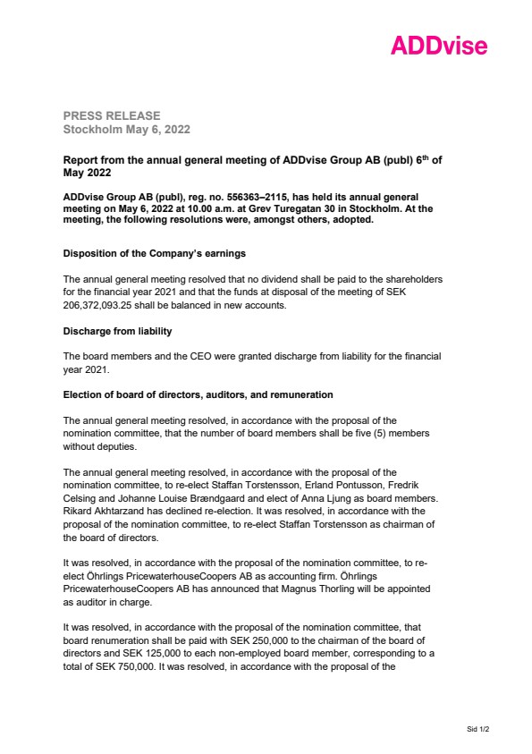Report from the annual general meeting of ADDvise Group AB (publ) 6th of May 2022