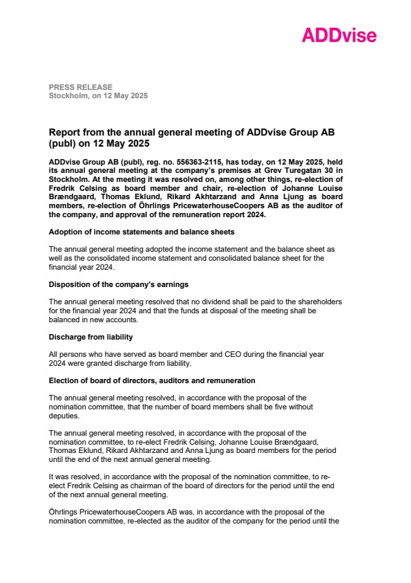 ADDvise Group AB (publ), reg. no. 556363-2115, has today, on 12 May 2025, held its annual general meeting at the company’s premises at Grev Turegatan 30 in Stockholm. At the meeting it was resolved on, among other things, re-election of Fredrik Celsing as board member and chair, re-election of Johanne Louise Brændgaard, Thomas Eklund, Rikard Akhtarzand and Anna Ljung as board members, re-election of Öhrlings PricewaterhouseCoopers AB as the auditor of the company, and approval of the remuneration report 2024.