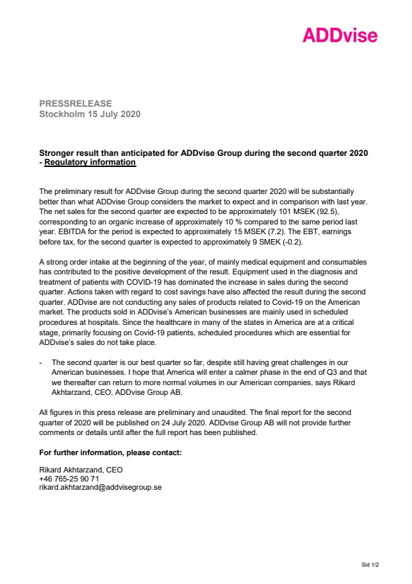 The preliminary result for ADDvise Group during the second quarter 2020 will be substantially better than what ADDvise Group considers the market to expect and in comparison with last year. The net sales for the second quarter are expected to be approximately 101 MSEK (92.5), corresponding to an organic increase of approximately 10 % compared to the same period last year. EBITDA for the period is expected to approximately 15 MSEK (7.2). The EBT, earnings before tax, for the second quarter is expected to approximately 9 SMEK (-0.2).
