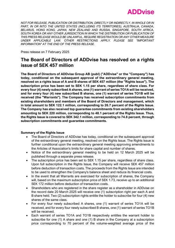 The Board of Directors of ADDvise Group AB (publ) (“ADDvise” or the “Company”) has today, conditional on the subsequent approval of the extraordinary general meeting, resolved on a rights issue of A and B shares of SEK 457 million (the “Rights Issue”). The subscription price has been set to SEK 1.15 per share, regardless of share class. For every four (4) newly subscribed A shares, one (1) warrant of series TO1A will be received, and for every four (4) new subscribed B shares, one (1) warrant of series TO1B will be received (the “Warrants”). The Company has received subscription commitments from existing shareholders and members of the Board of Directors and management, which in total amount to SEK 122.1 million, corresponding to 26.7 percent of the Rights Issue. The Company has also received top guarantee commitments from existing shareholders amounting to SEK 220 million, corresponding to 48.1 percent of the Rights Issue. Thus, the Rights Issue is covered to SEK 342.1 million, corresponding to 74.8 percent, through subscription commitments and guarantee commitments.