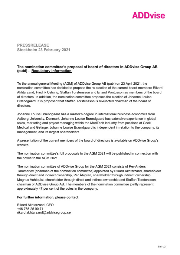 To the annual general Meeting (AGM) of ADDvise Group AB (publ) on 23 April 2021, the nomination committee has decided to propose the re-election of the current board members Rikard Akhtarzand, Fredrik Celsing, Staffan Torstensson and Erland Pontusson as members of the board of directors. In addition, the nomination committee proposes the election of Johanne Louise Brændgaard. It is proposed that Staffan Torstensson is re-elected chairman of the board of directors.