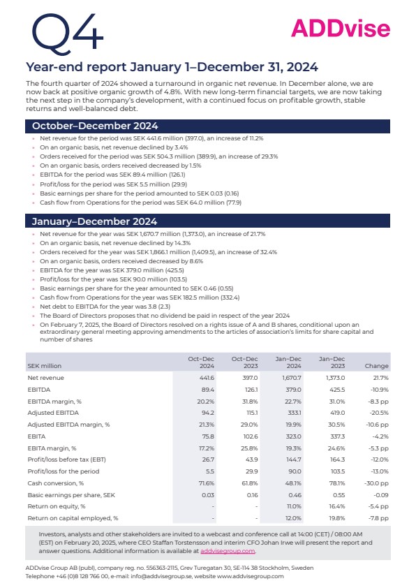 The Board of Directors has adopted new long-term financial targets, designed to ensure profitable growth, financial stability and long-term shareholder value. These targets aim for ADDvise to: