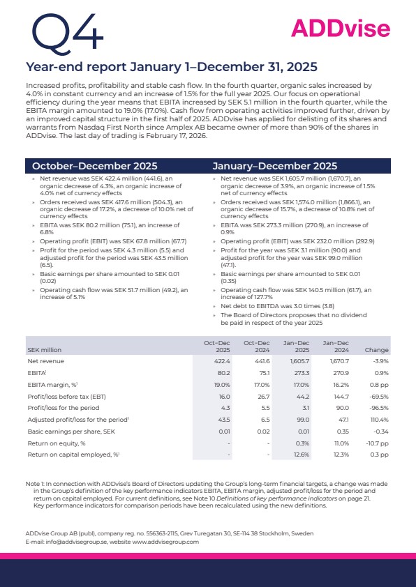 Increased profits, profitability and stable cash flow. In the fourth quarter, organic sales increased by 4.0% in constant currency and an increase of 1.5% for the full year 2025. Our focus on operational efficiency during the year means that EBITA increased by SEK 5.1 million in the fourth quarter, while the EBITA margin amounted to 19.0% (17.0%). Cash flow from operating activities improved further, driven by an improved capital structure in the first half of 2025. ADDvise has applied for delisting of its shares and warrants from Nasdaq First North since Amplex AB became owner of more than 90% of the shares in ADDvise. The last day of trading is February 17, 2026.